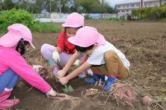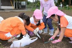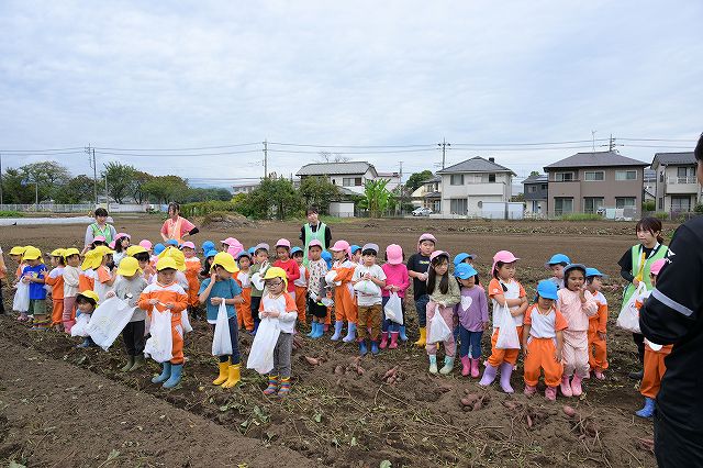 すみれ組はひまわり組のお兄さんお姉さんと手をつなぎ、ゆり組はお友達と手をつなぎ畑へさつまいも堀りに行ってきました。たくさんのさつまいもを見て、闘志を燃やす園児たち。大きいのから小さいのまで一つも残らず掘り起こしました。すみれ組・ゆり組・ひまわり組の皆さんお疲れ様でした。